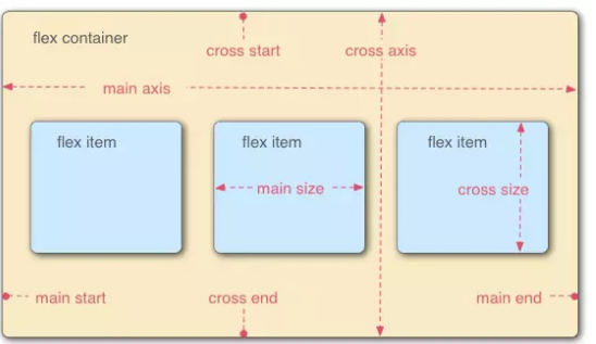 在 flex 容器中默认存在两条轴,水平主轴(main axis) 和垂直的交叉轴(cross axis),水平主轴可以理解为水平方向,交叉轴可理解为垂直方向。